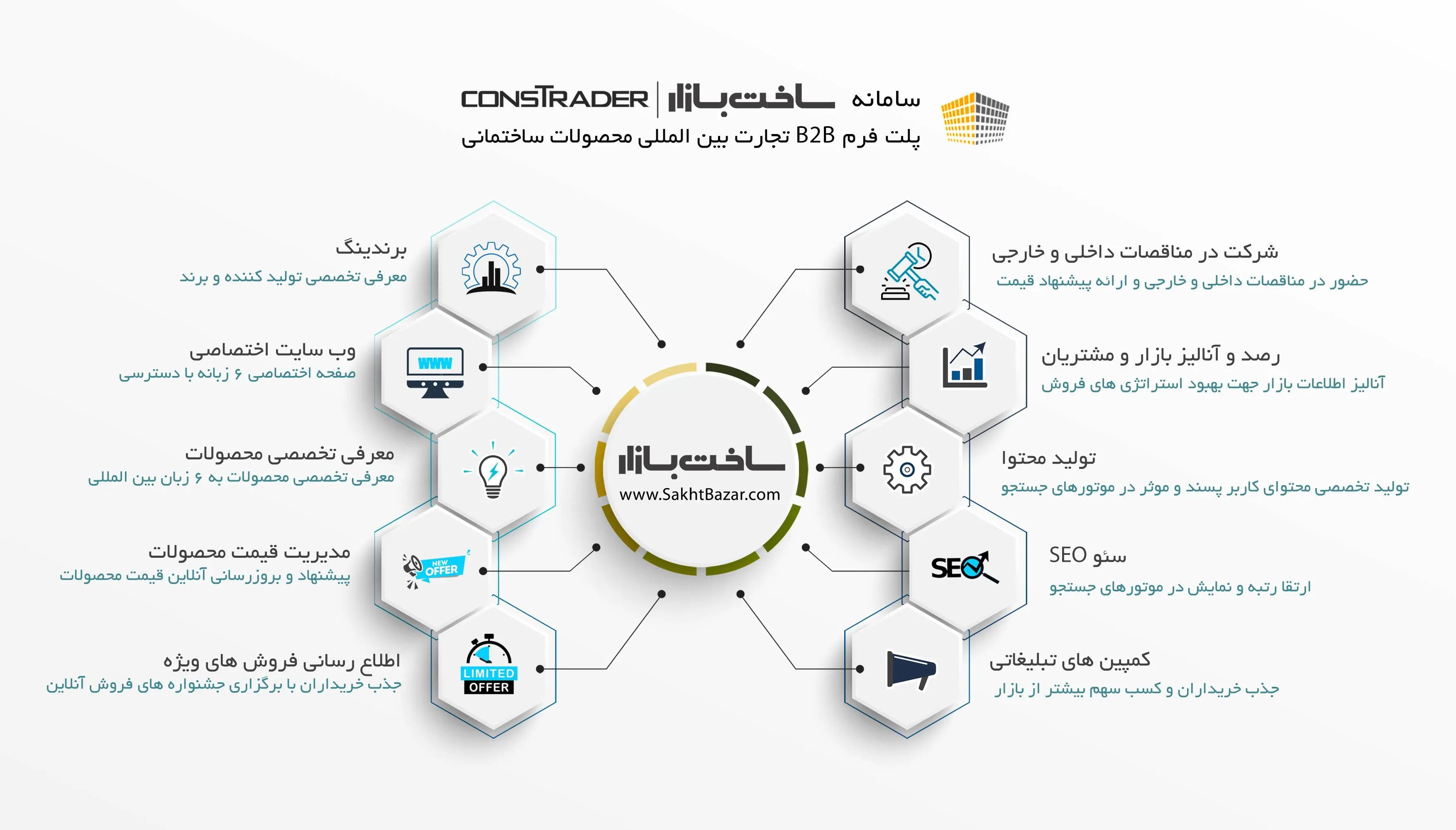 ساخت بازار با بررسی تخصصی محصولات ساختمانی، نسبت به معرفی آن به خریداران داخلی و خارجی با ارائه مشخصات فنی، تصاویر، فیلم و انتقال تجربیات دیگران مصرف کنندگان به چندین زبان بین المللی در فروش مصالح ساختمانی اقدام می نماید.